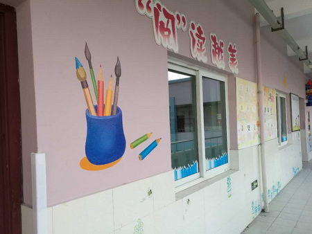 墻繪卡通圖案在幼兒園的主題墻裝飾中非常流行,成本低,效果好,為幼兒園設計中首選裝飾方法。