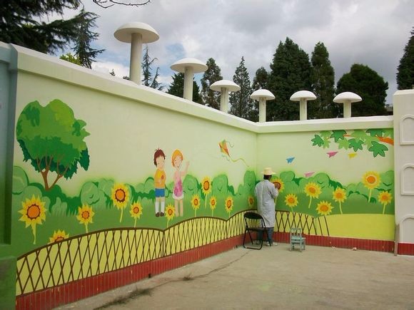 墻繪卡通圖案在幼兒園的主題墻裝飾中非常流行,成本低,效果好,為幼兒園設(shè)計(jì)中首選裝飾方法。