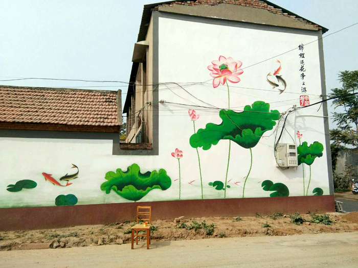 大部分情況來說,農村墻體彩繪都是用丙烯顏料來畫的,成本低,效果好,能夠有一定程度的防水。