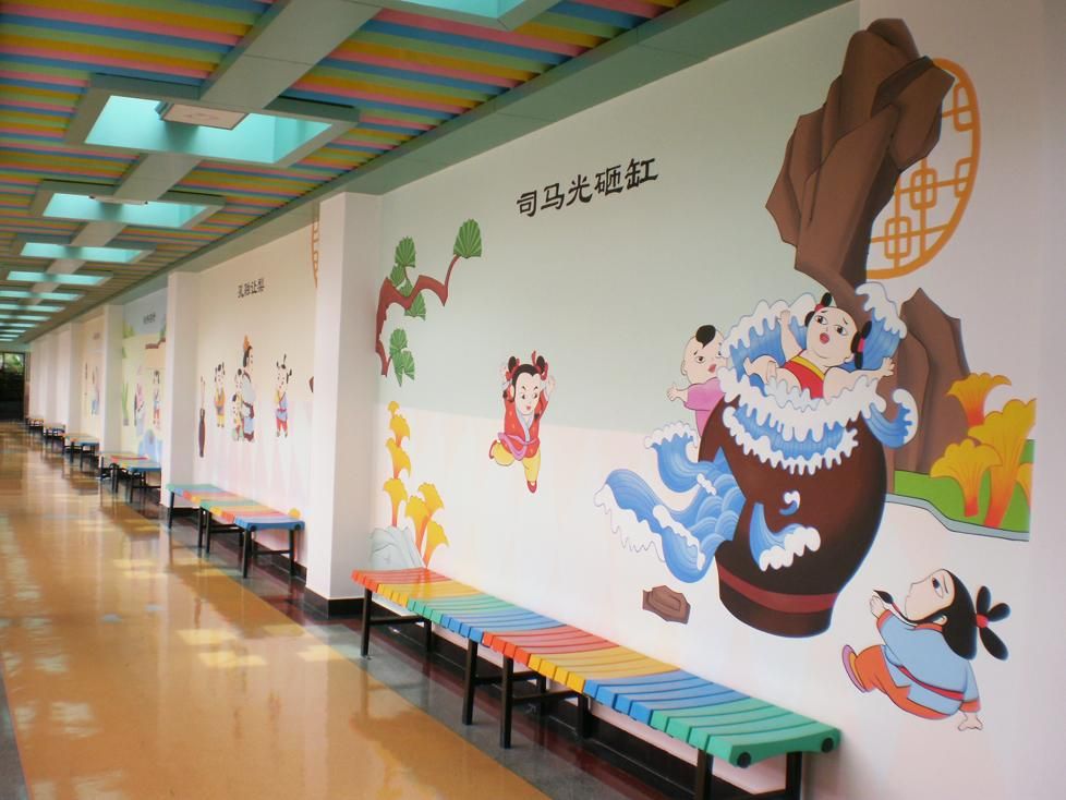 墻繪卡通圖案在幼兒園的主題墻裝飾中非常流行,成本低,效果好,為幼兒園設計中首選裝飾方法。