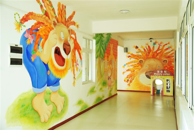 墻繪卡通圖案在幼兒園的主題墻裝飾中非常流行,成本低,效果好,為幼兒園設(shè)計(jì)中首選裝飾方法。